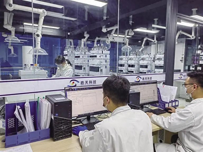 走進(jìn)皓天科技研發(fā)中心,儼然是走進(jìn)了一個(gè)科學(xué)院所的實(shí)驗(yàn)室。在一樓合成實(shí)驗(yàn)室里,戴著防護(hù)鏡的科研人員手里不停晃動(dòng)著燒瓶,認(rèn)真觀察正在發(fā)生的化學(xué)反應(yīng),旁邊的幾臺(tái)實(shí)驗(yàn)設(shè)備運(yùn)轉(zhuǎn)如常,進(jìn)行著分離、濃縮等操作,幾位科研人員坐在電腦前及時(shí)記錄、分析試驗(yàn)中的各項(xiàng)數(shù)據(jù)。就是在這些實(shí)驗(yàn)室里,累計(jì)完成100多個(gè)原料藥、300多個(gè)高級(jí)中間體的工藝研發(fā)。
